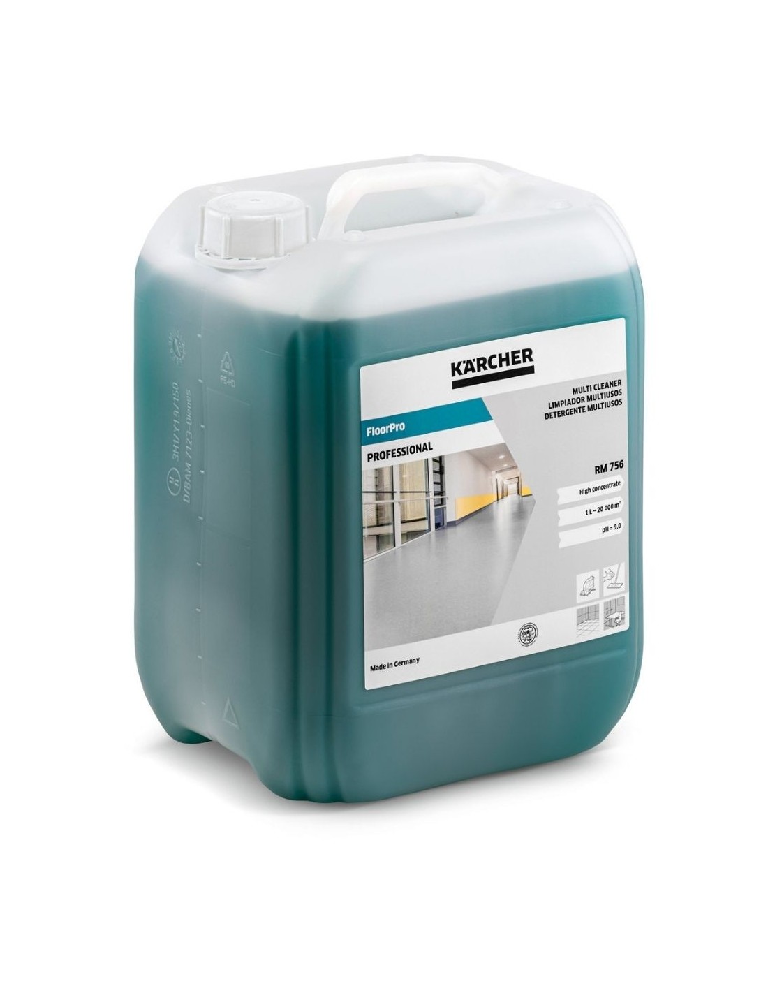 La fórmula altamente humectante del limpiador FloorPro Multi RM 756 de Kärcher ofrece una gran cantidad de ventajas para la limpieza de mantenimiento con equipos o manual, cuidadosa y en profundidad, de todos los suelos y superficies resistentes al agua, duros y elásticos (ESD). Gracias a la combinación especial de tensioactivos, este versátil detergente también es especialmente adecuado para superficies hidrófobas, como revestimientos de suelo de PUR. Además de asegurar un extraordinario rendimiento de limpieza al absorber eficazmente la grasa, el aceite y la suciedad mineral, garantiza un secado uniforme, sin marcas y rápido. El limpiador FloorPro Multi RM 756 forma poca espuma para un uso eficiente del volumen del depósito de las fregadoras-aspiradoras y deja una fragancia agradable y duradera después de la limpieza. La elevada seguridad de uso de este producto altamente concentrado sin exigencias de etiquetado es otra ventaja para los profesionales de limpieza de edificios.