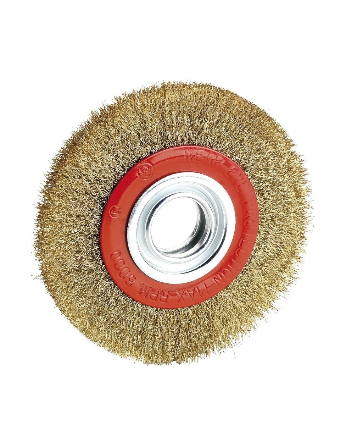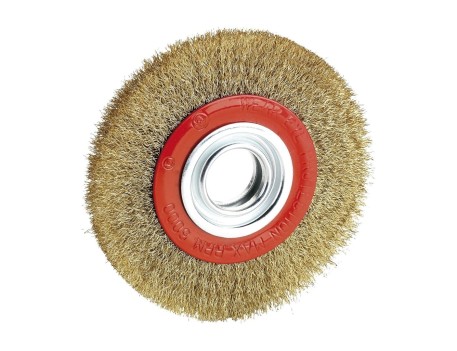 Cepillo metálico circular para esmeriladoras, indicado para la eliminación de óxidos, pinturas y rebabas, ideal para la limpieza de cascarilla en piezas de forja y fundición, con alambre latonado de alta calidad, ondulado y de 0,30 mm de espesor para garantizar una larga vida útil y una limpieza exhaustiva, suministrado con adaptadores para ejes lisos que permiten su uso en distintas máquinas y protegido junto con estos en un estuche individual, siendo una herramienta perfecta para trabajos profesionales que requieran alta efectividad y cuyo uso debe realizarse con precaución siguiendo todas las medidas de seguridad necesarias para un funcionamiento seguro y eficaz.