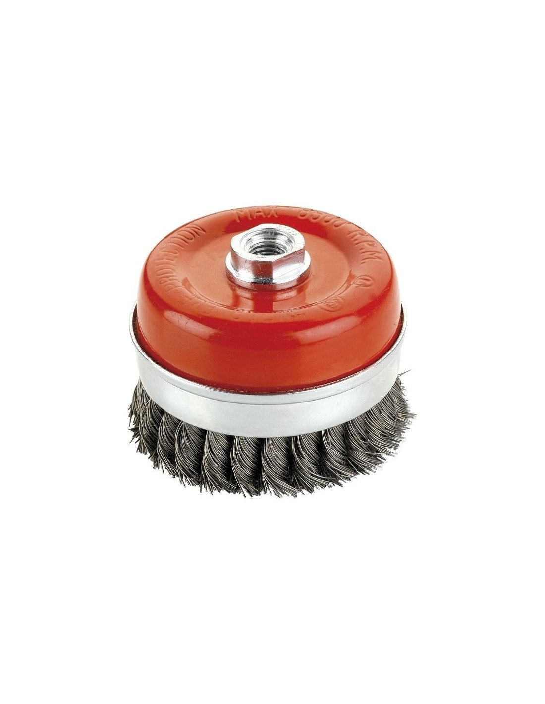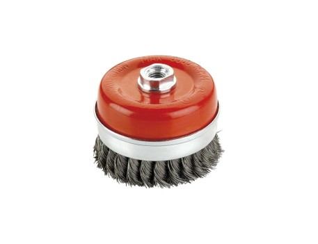 Cepillo metálico de taza para máquinas eléctricas como amoladoras, ideal para eliminar pintura, óxido y rebabas, perfecto para trabajar sobre superficies amplias en las que se necesite una herramienta con gran capacidad; cuenta con una sujeción de tornillo roscado (M14) que garantiza una correcta unión con la herramienta que se esté utilizando; el alambre de este cepillo es de acero trenzado, un material que facilita la retirada eficaz de diferentes tipos de adherencias; fabricado con materiales de calidad, algo que garantiza su resistencia y la vida útil del producto.