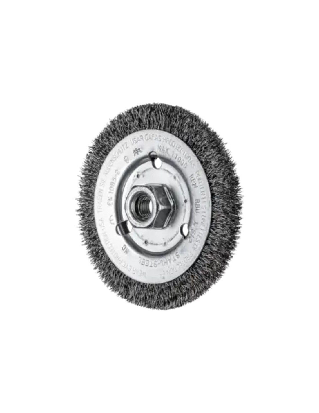 Carda redonda sin trenzar RBU de 125x12 mm con rosca M14 y alambre de acero de 0,30 mm para amoladora angular, longitud de cerda 15 mm, sistema de fijación por rosca, velocidad máxima 11.000 r.p.m., velocidades óptimas entre 5.500 y 11.000 r.p.m., diámetro exterior 125 mm, diámetro del alambre 0,3 mm, embalaje POS.