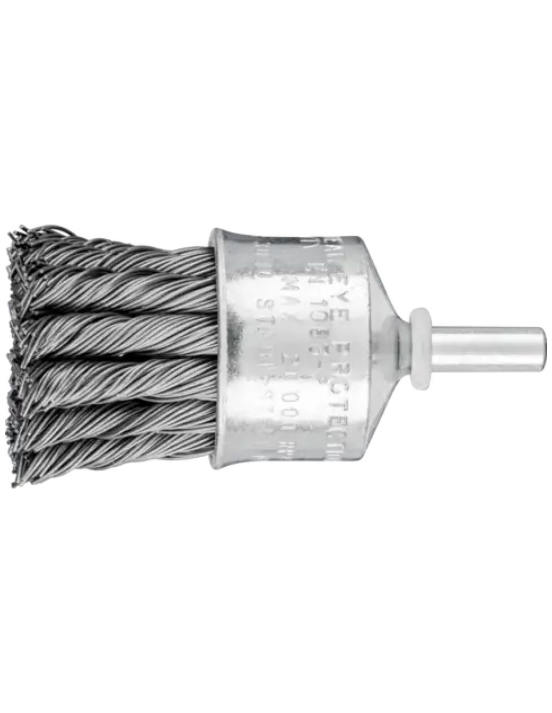 Carda brocha POS trenzada PBG Ø 30 mm con mango Ø 6 mm, fabricada con alambre de acero (ST) Ø 0,50 mm y 12 alambres trenzados, con longitud de cerda de 25 mm, longitud total de 68 mm, vaso Ø 28 mm y Ø exterior de 30 mm, sistema de fijación mediante mango, velocidad máxima de 20.000 r.p.m. y óptima entre 8.000 y 11.300 r.p.m., presentada en embalaje POS y con unidad de embalaje de 10 piezas.
