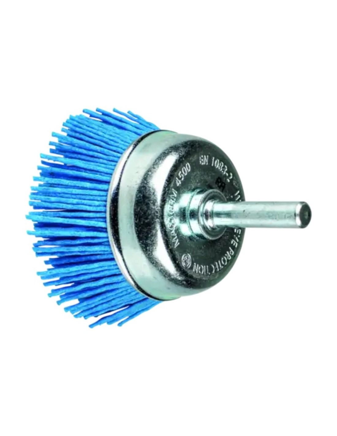 Carda vaso sin trenzar TBU de Ø 50 mm con mango Ø 6 mm y filamento sintético BLUE Ø 1,10 mm, grano 180, longitud de cerda 20 mm, sistema de fijación mediante mango, velocidad máxima 4.500 r.p.m., diámetro exterior 50 mm, diámetro del filamento 1,1 mm, unidad de embalaje 1 pieza, diseñada para uso en taladros.