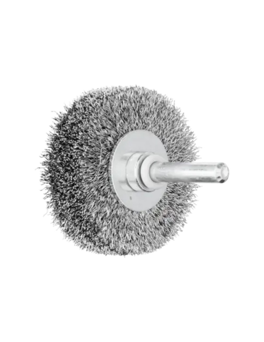 Carda redonda POS sin trenzar RBU de 50x15 mm con mango de 6 mm, cerda de alambre de acero de 0,20 mm y longitud de cerda de 13 mm, longitud total de 50 mm, sistema de fijación por mango, velocidad máxima de 15.000 r.p.m., velocidad óptima de 7.500 a 11.300 r.p.m., diámetro exterior de 50 mm y diámetro de mango de 6 mm, presentada en embalaje POS.