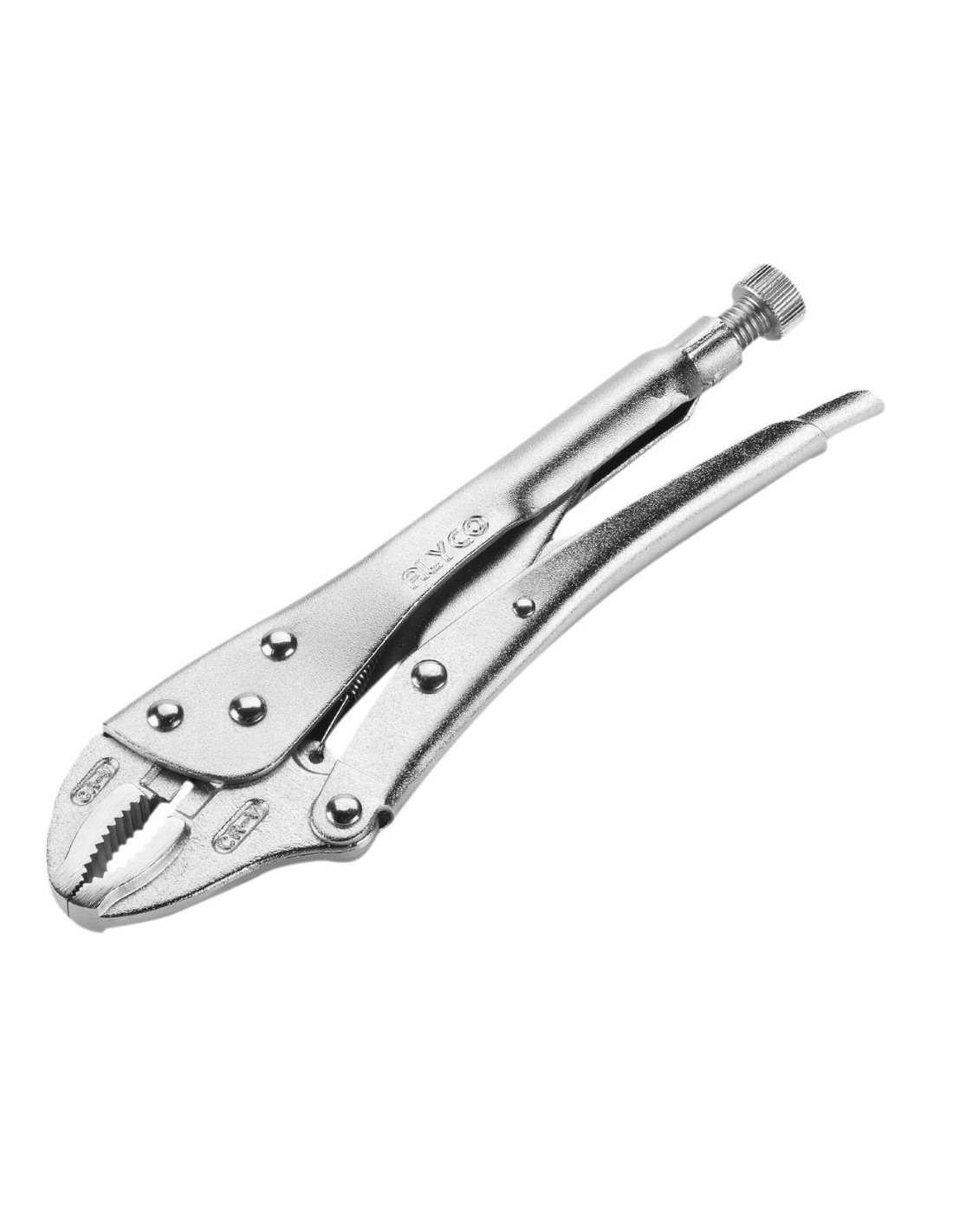 Tenaza de presión con mordaza bloqueable, ideal para inmovilizar piezas o superficies durante operaciones de pegado, soldadura u otras tareas que requieren sujeción firme; fabricada con bocas de acero al Cromo-Vanadio forjadas y tratadas térmicamente por inducción, ofrece alta resistencia y larga vida útil, incorpora un diseño curvo con estrías para asegurar el agarre de piezas cilíndricas o redondeadas, además de filos de corte integrados para cortar alambres; la gran apertura de las bocas, junto con la tuerca de regulación en uno de los mangos y la palanca de bloqueo en el otro, permiten ajustar la presión de forma precisa y liberar las manos para trabajar con comodidad, siendo una herramienta indispensable en entornos industriales, fontanería, calefacción y tareas de ensamblaje o reparación.