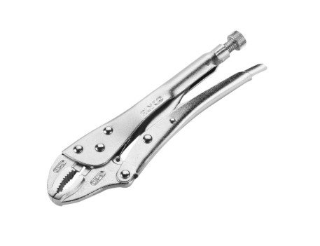 Tenaza de presión con mordaza bloqueable, ideal para inmovilizar piezas o superficies durante operaciones de pegado, soldadura u otras tareas que requieren sujeción firme; fabricada con bocas de acero al Cromo-Vanadio forjadas y tratadas térmicamente por inducción, ofrece alta resistencia y larga vida útil, incorpora un diseño curvo con estrías para asegurar el agarre de piezas cilíndricas o redondeadas, además de filos de corte integrados para cortar alambres; la gran apertura de las bocas, junto con la tuerca de regulación en uno de los mangos y la palanca de bloqueo en el otro, permiten ajustar la presión de forma precisa y liberar las manos para trabajar con comodidad, siendo una herramienta indispensable en entornos industriales, fontanería, calefacción y tareas de ensamblaje o reparación.