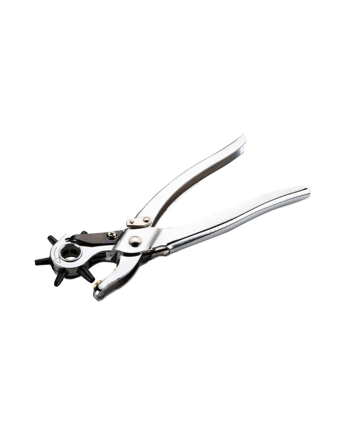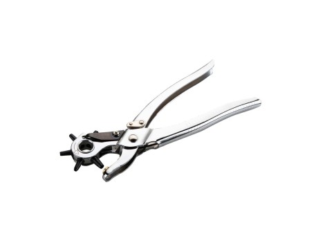 Alicate rotativo de revólver con presión para agujerear superficies en diferentes diámetros mediante presión; cuerpo fabricado en acero cromado que evita la oxidación; tambor giratorio con 6 diámetros intercambiables de punzones: 2, 2.5, 3, 3.5, 4 y 5 mm; articulación de presión que facilita la perforación reduciendo el esfuerzo; ideal para realizar agujeros de distintos diámetros en materiales como tela, cartón, cuero, chapa delgada, entre otros.