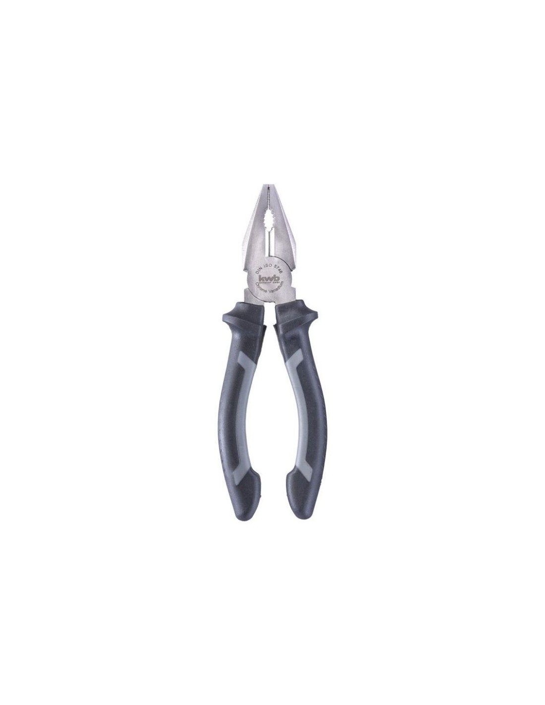 Alicates universales conforme a DIN ISO 5746, acero C.V., acabado satinado mate, mango de 2 componentes para la transmisión óptima de la fuerza y trabajar sin cansancio, con zonas de agarre para material plano y redondo, para uso versátil, con filos planos y bordes de la cabeza biselados, para alambre duro y blando, filos templados. Con práctico soporte para el taller, para ello tan solo es necesario atornillar el clip de plástico en el panel mural de herramientas.