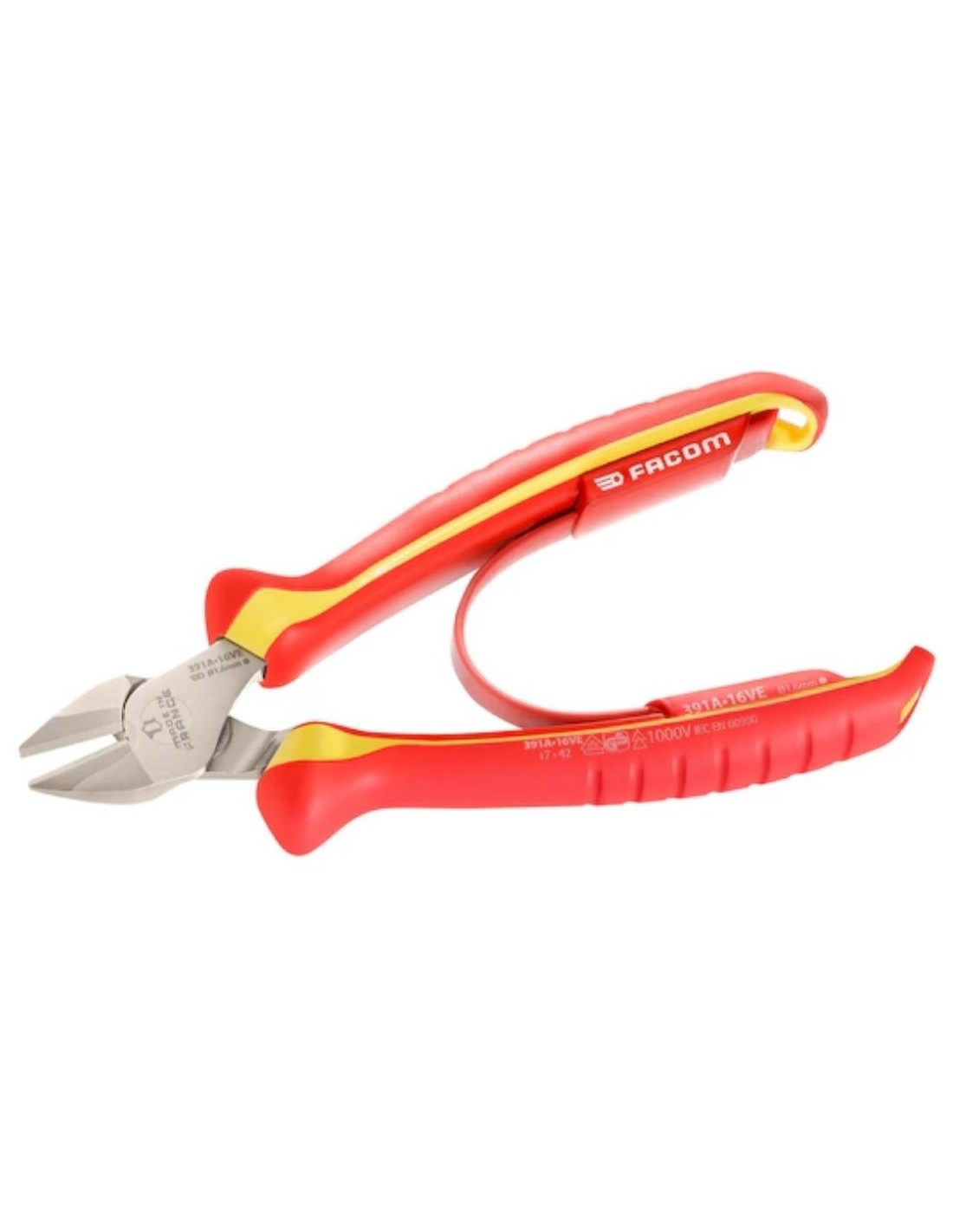 Alicate corte diagonal Facom 391A.16VE aislado electricista. Cabeza afilada accesos difíciles, filos templados inducción, vainas ergonómicas bi-material.