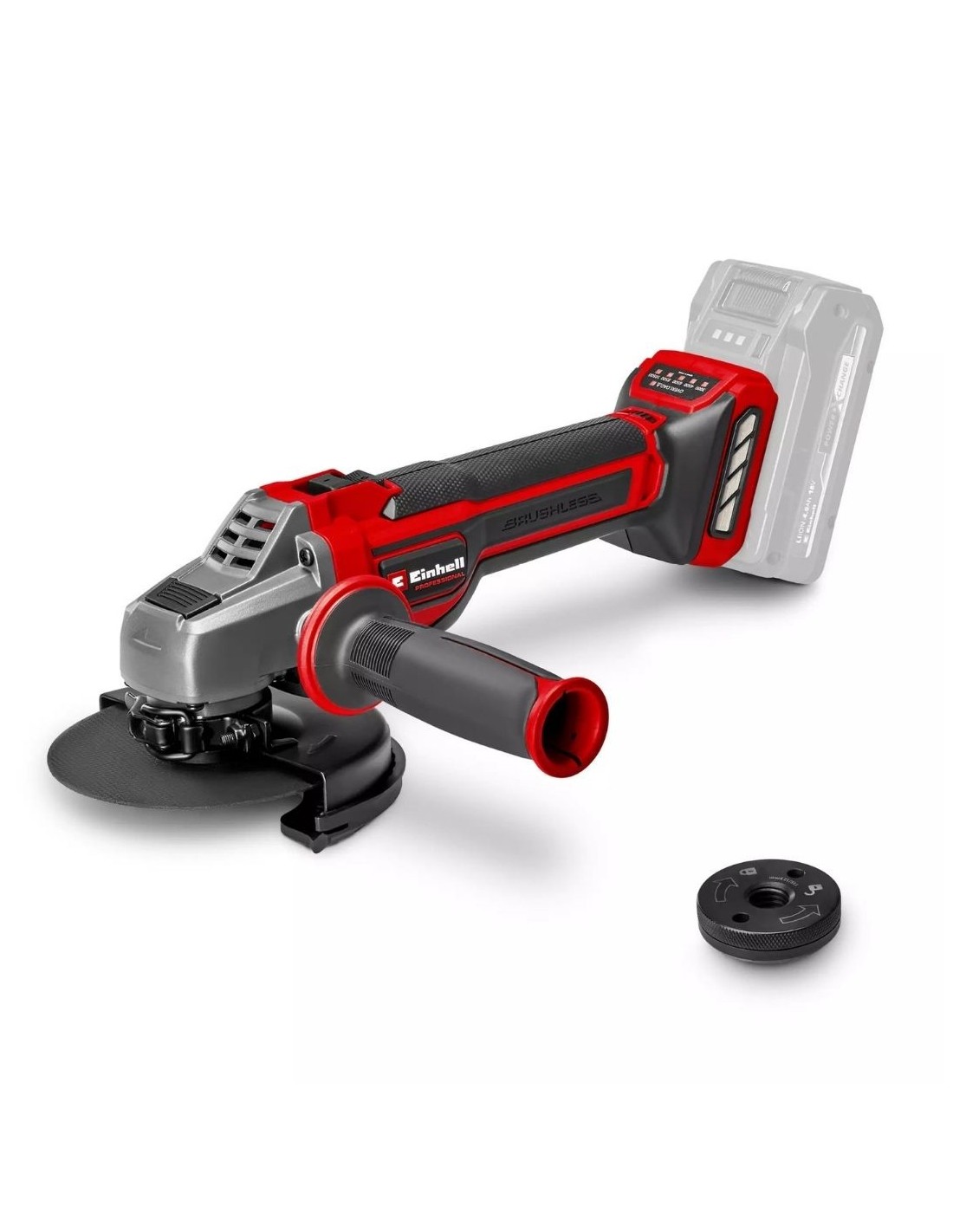 Amoladora angular profesional Einhell TP-AG 18/125 con motor sin escobillas PurePOWER equivale 900W cable. Velocidad regulable 3000-10500 rpm adapta material trabajo. Garantía 10 años motor tras registro online. Cambio disco sin herramientas mediante tuerca sujeción rápida. Electrónica constante mantiene potencia sin pérdida velocidad. Empuñadura adicional montable dos posiciones mejora control. Superficie apoyo permite colocación segura equipo.