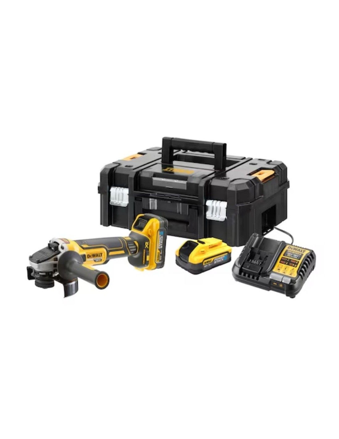 Amoladora angular DeWalt DCG409H2T motor sin escobillas mayor eficiencia durabilidad herramienta. Freno electrónico motor reduce reacción contragolpe atasco parada mayor control seguridad. Embrague electrónico reduce reacción contragolpe atasco parada protección operario. Arranque electrónico suave inicio tarea controlado menor impacto inicial. Protector malla restringe polvo aspirado motor prolonga vida útil. Cuerpo revestido goma proporciona mejor agarre comodidad trabajo prolongado. Batería PowerStack 5Ah máximo rendimiento autonomía trabajo