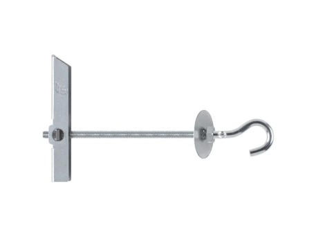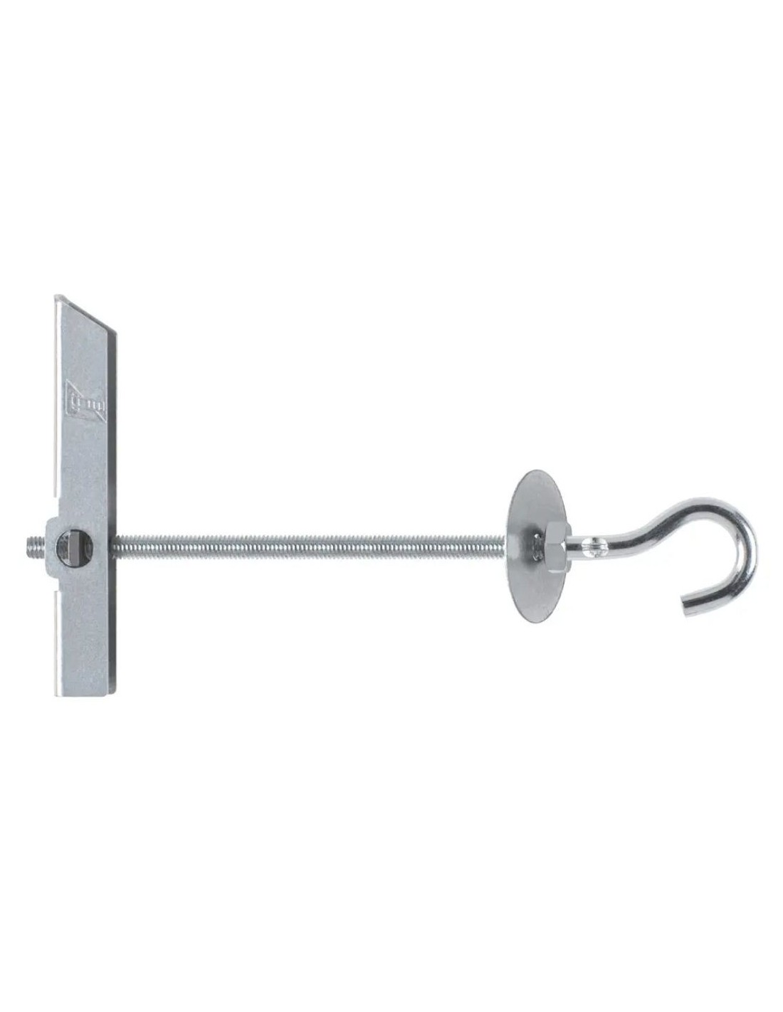 Taco de vuelco con gancho, tuerca y arandela. Se puede emplear para instalar con facilidad elementos ligeros en falsos techos de yeso laminado, escayola u otros materiales huecos. Permite instalar en suspensión lámparas, plafones o ventiladores de techo. Está fabricado en acero con recubrimiento zincado.