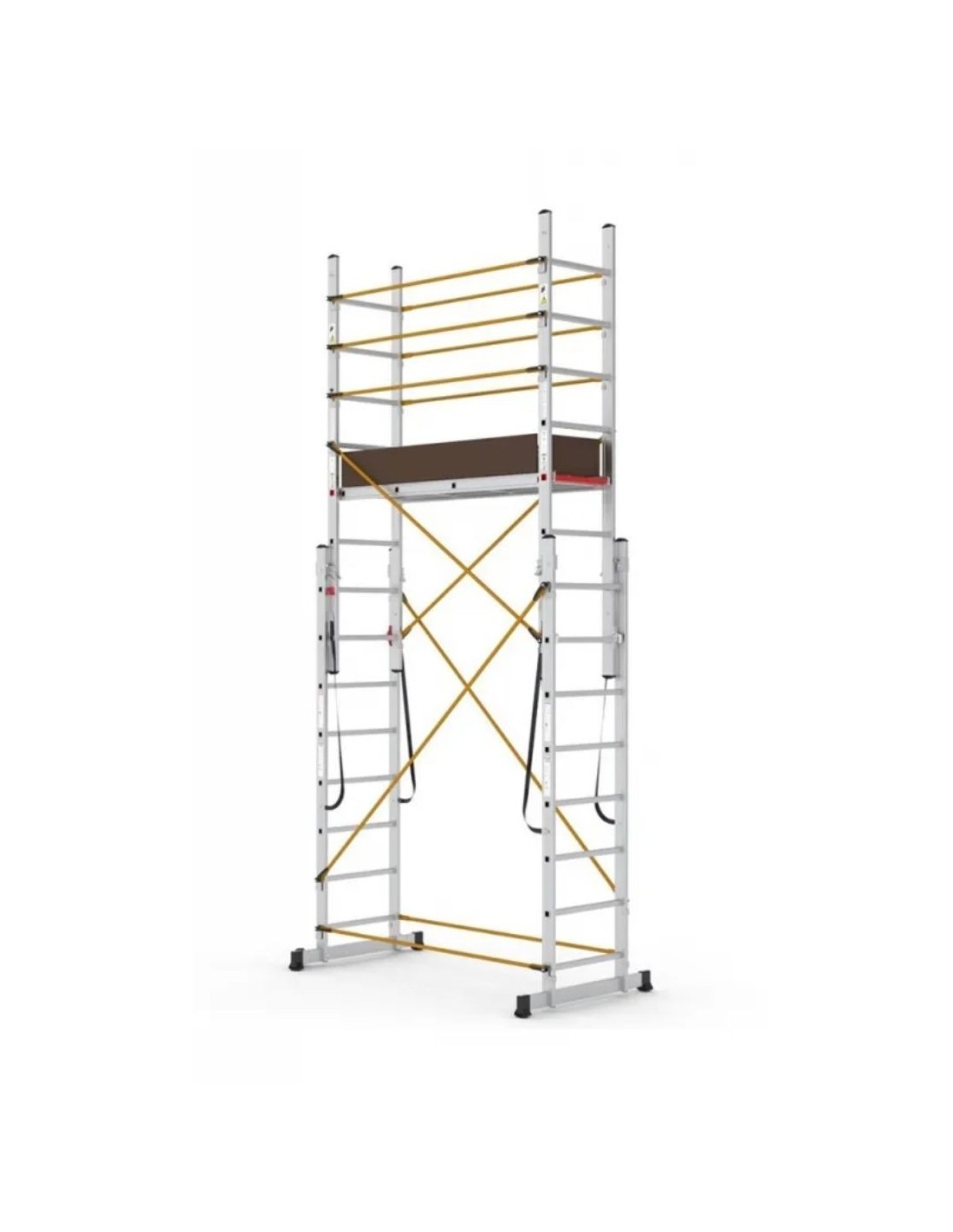 Este equipo de trabajo en altura se compone de dos escaleras de aluminio transformables unidas por barras diagonales y horizontales de acero pintado que se enganchan rápidamente para crear una estructura rígida y estable. Gracias a su diseño con pocos componentes y la ausencia de herramientas para su montaje, resulta muy fácil de transportar y almacenar una vez desmontado.
