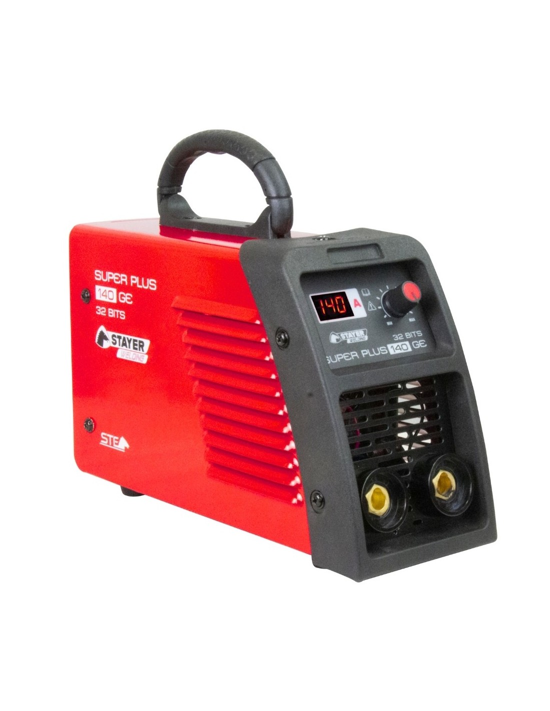 Soldadora Stayer Super Plus 140 GE K MMA 140A electrodo recubierto factor marcha 100% aire 30°C. Control inteligente, peso 2.2kg, maletín plástico.