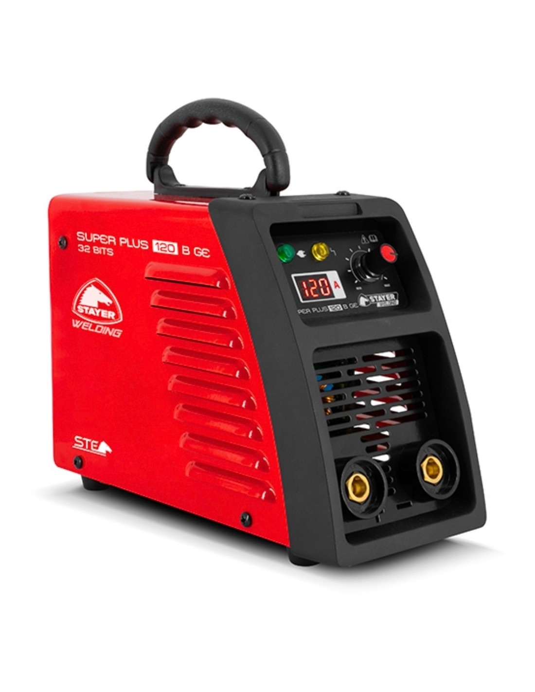 Soldador profesional Stayer Super Plus 120A con factor marcha 100% a 30°C. Equipo electrónico para arco eléctrico con control inteligente STAYER WELDING: Hot Start, Arc Force y Anti Stick. Suelda electrodos 1.6-3.2mm. Incluye cables, martillo, maletín. Peso 2.5kg, voltaje vacío 64Vdc. Construcción europea, máxima densidad potencia. Perfecto mantenimiento y construcción.