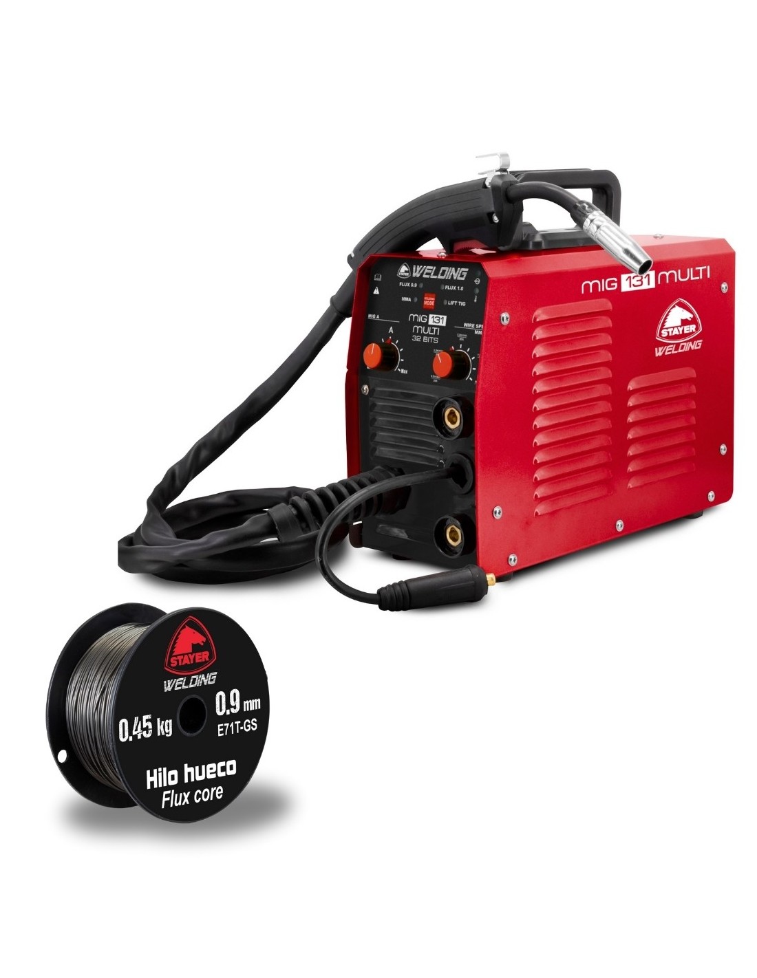 El lote de soldadora Soldador Stayer MIG 131 MULTI 3 en 1: Flux Core hilo hueco sin gas, TIG Lift Arc, electrodo y la Bobina de 0.45KG es el kit completo para soldar.