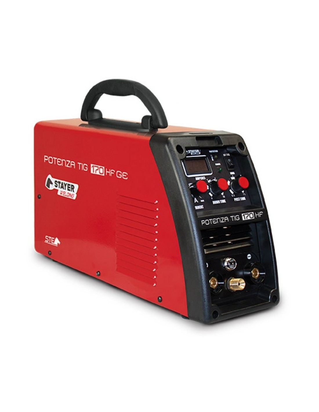 Soldador profesional Stayer Potenza TIG 170 HF con cebado sin contacto por arco piloto alta frecuencia. Soldadura electrodo revestido y TIG de máxima calidad. Factor marcha 60%, 170A. Control inteligente ST WELDING: Hot Start, Arc Force, Anti Stick, Down time, Post time. Incluye antorcha TIG HF 2.5m. Componentes IGBT 600V, transformador ferrita toroidal. Peso ultraligero 6kg.