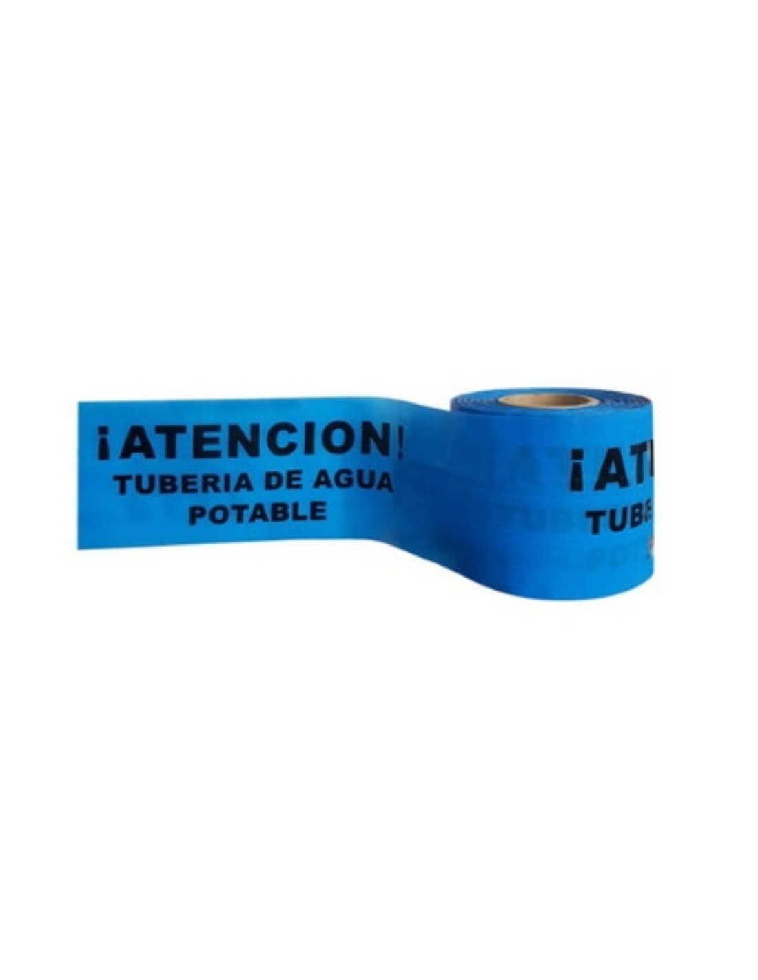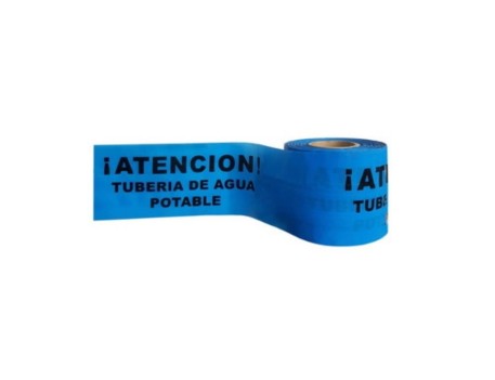 Cinta para señalización subterránea de tuberías de agua, con texto negro “¡ATENCIÓN! TUBERÍA AGUA”, utilizada para advertir de la presencia de conducciones de agua bajo el suelo.