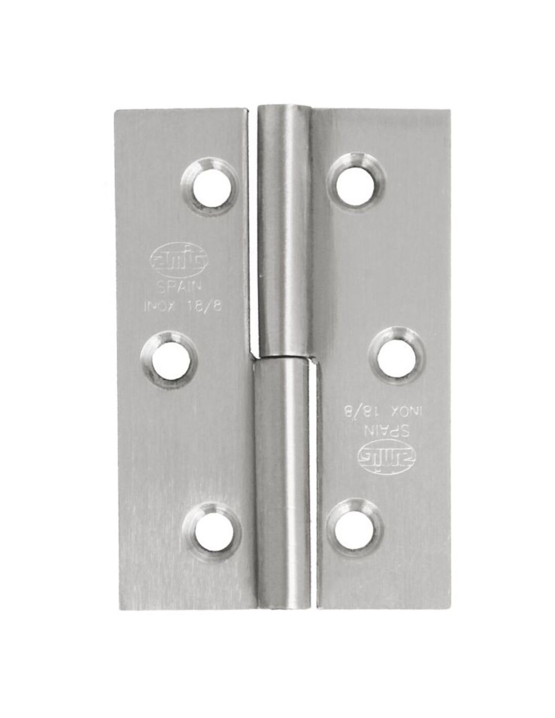 Bisagra Amig de acero inoxidable 18/8 para puertas, 60x40 mm. Ideal para uso en interiores y exteriores, garantiza durabilidad y resistencia.