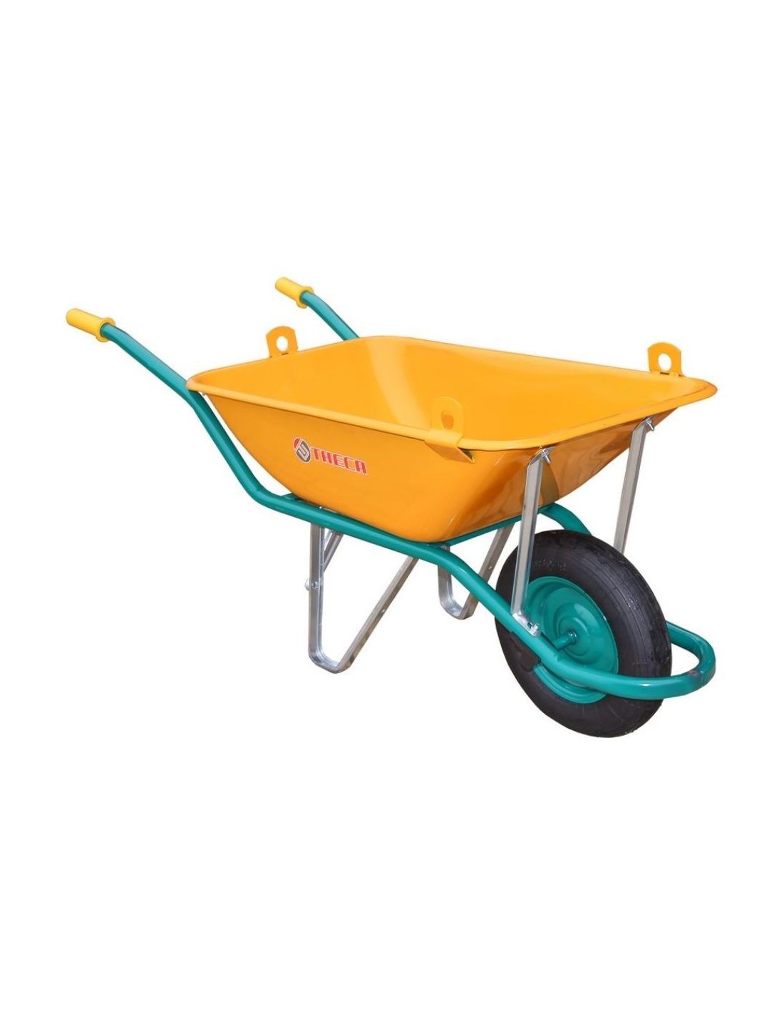 Carretilla pintada THECA de 90 L, especialmente adecuada para el sector de la construcción gracias a sus ganchos opcionales para grúa, entregadas montadas en palets de 20 unidades, con precio indicado franco de transporte por palet de 20 piezas montadas, pudiendo también entregarse desmontadas en palets de 100 unidades, con presupuesto disponible a solicitud.