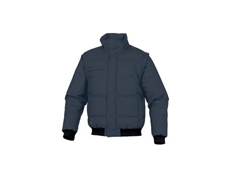 Cazadora acolchada profesional DELTAPLUS RANDERS2 azul marino-negro. Prenda 2 en 1 con mangas desmontables adaptable a cambios temperatura. Tejido 100% Poliamida impregnado PU transpirable. Relleno 100% fibra poliéster 230g/m². Forro 100% poliéster tafetán. Hidrófuga contra lluvia ligera, cortavientos. Capucha desmontable con broche, cuello alto. Cierre cremallera y solapa. Parte inferior acanalada. 3 bolsillos exteriores (2 cremallera, 1 solapa), 2 interiores (1 cremallera, 1 teléfono). Certificación CE protección frío. Tallas S-3XL. Peso 418g/m². Ideal reformas, transporte, almacenamiento. Marcaje serigrafía/transfer. Uso profesional intensivo.