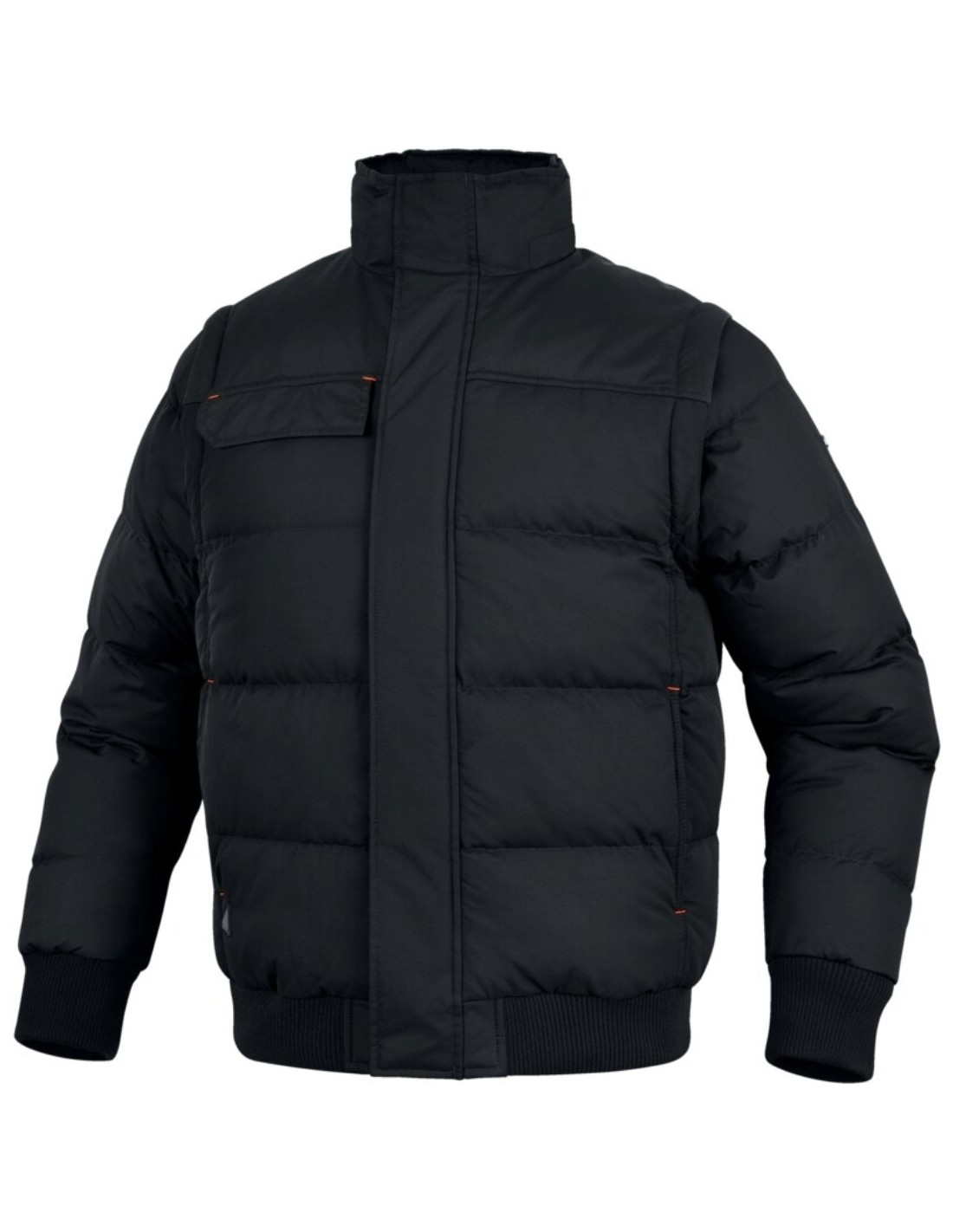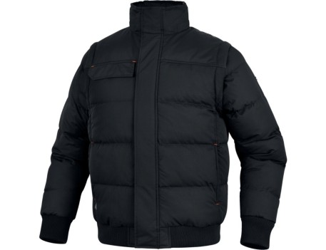 Cazadora acolchada profesional DELTAPLUS RANDERS2 negro 2 en 1 con mangas desmontables adaptable a cambios temperatura. Tela 100% poliamida revestimiento poliuretano transpirable. Forro tafetán 100% poliéster. Relleno 100% fibra poliéster. Peso 418g/m². Hidrófuga cortavientos lluvia ligera. Capucha desmontable con broche. Cierre cremallera y solapa. Parte inferior acanalada. Capacidad metálica. 3 bolsillos exteriores (2 cremallera, 1 solapa), 2 interiores (1 cremallera, 1 teléfono). Certificación CE Categoría I EN ISO 13688. Protección frío. Tallas S-3XL. Ideal reformas, transporte, almacenamiento. Marcaje serigrafía/transfer. Uso profesional.