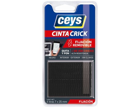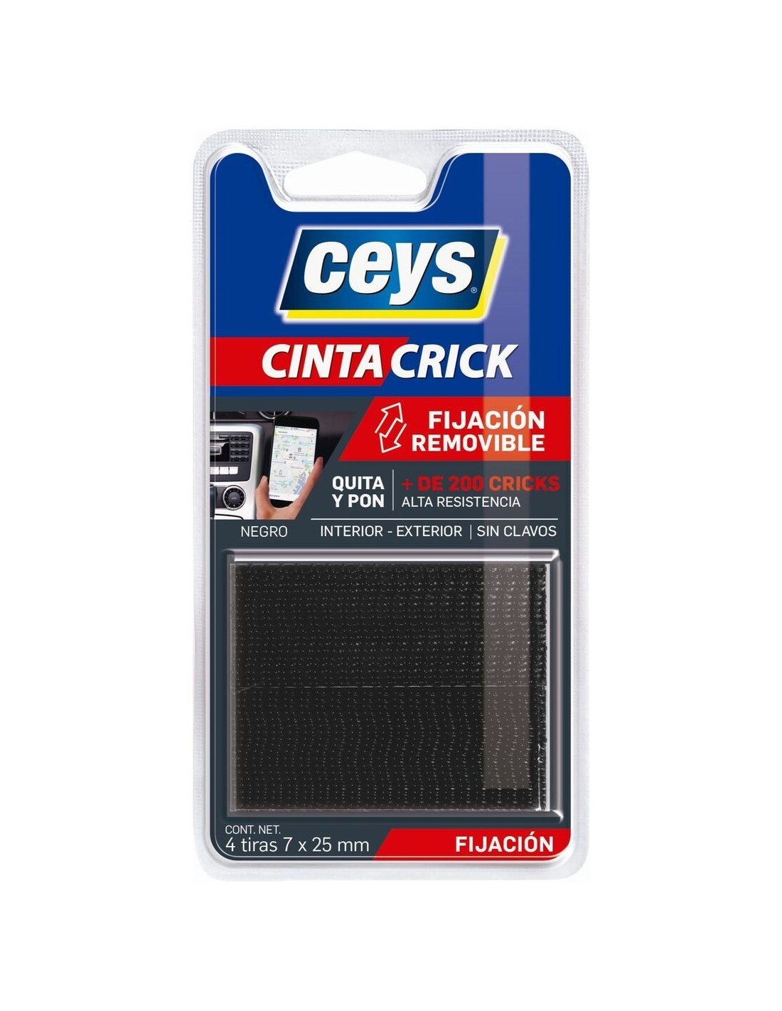 Ceys Tackceys Crick negro con 4 tiras de 7cm x 25mm. Ideal para reparaciones y fijaciones en múltiples superficies. Versatilidad y calidad garantizadas.