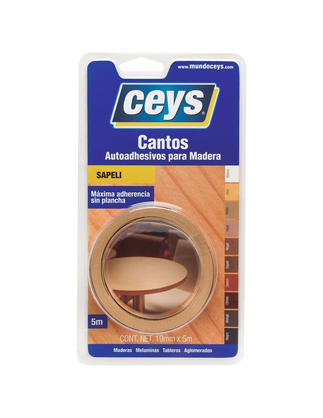 Canto autoadhesivo CEYS de 5 metros en acabado sapeli. Ideal para acabados en muebles y reparaciones. Fácil aplicación y gran durabilidad.