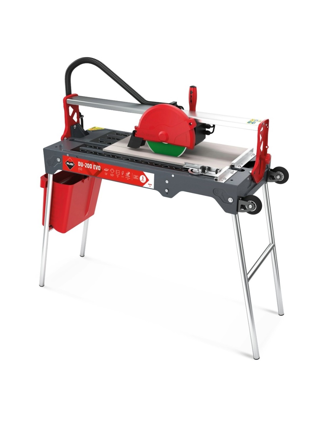 Las cortadoras DU-EVO de RUBI, son cortadoras eléctricas de cabezal móvil, concebidas para realizar reformas y trabajos ligeros. Son perfectas para el corte general de baldosa cerámica. Las cortadoras eléctricas DU-EVO, están especialmente recomendadas para el corte PROFESIONAL de azulejo (tipo BIII) y gres esmaltado (tipo BIIa) y para el corte OCASIONAL de gres porcelánico (tipo BIa).Las cortadoras eléctricas DU-EVO de RUBI están equipadas con un conjunto motor de transmisión directa, de 1,1 CV (0,8 kW) de potencia y con protector térmico.El cabezal de las cortadoras eléctricas DU-EVO de RUBI se desliza sobre 4 rodamientos, y es abatible a 45º para la realización de cortes a inglete y está equipado con una mango bi-material para dar al usuario una mayor ergonomía y confort.Las cortadoras eléctricas DU-EVO de RUBI incorporan, de serie, un disco de diamante de banda continua de Ø 200 mm., CEV-SUPERPRO para el corte general de baldosa cerámica.Las cortadoras DU-EVO incorporan el exclusivo C3 SYSTEM de RUBI. Un sistema que permite regular el punto de refrigeración y limpieza del disco según las necesidades del usuario, mejorando sustancialmente el rendimiento del disco de diamante. La bomba de agua de 8 W con grifo regulador, permite adaptar el caudal a cada tipo de material cerámico.El innovador diseño del chasis incorpora un sistema de recogida que agua más eficaz, permitiendo recuperar hasta un 50% más de agua. El depósito, de 8 litros de capacidad, es fácilmente extraíble, tanto para su llenado como para su limpieza y transporte.Las cortadoras eléctricas DU-EVO de RUBI también disponen de un sistema de patas plegables que, además de aportar una mayor estabilidad a la herramienta, ofrece al profesional una altura de trabajo de 90 cm. Las ruedas y asa incorporadas en el chasis facilitan enormemente la manipulación y transporte de los modelos de la gama DU-EVO.Todos los modelos de la gama DU-EVO incluyen, de serie, una escuadra de aluminio, milimetrada, y un tope lateral ajustable para realizar cortes repetitivos y angulares, con un rango de acción de 0º a 45º.La marca RUBI es conocida por la gran durabilidad y por la calidad de sus herramientas. Desde hace ya más de 65 años, RUBI fabrica solamente productos de alta durabilidad y resistencia, para poder dar el mejor rendimiento ante las condiciones de trabajo más duras y adaptándose a las exigencias de cada mercado.