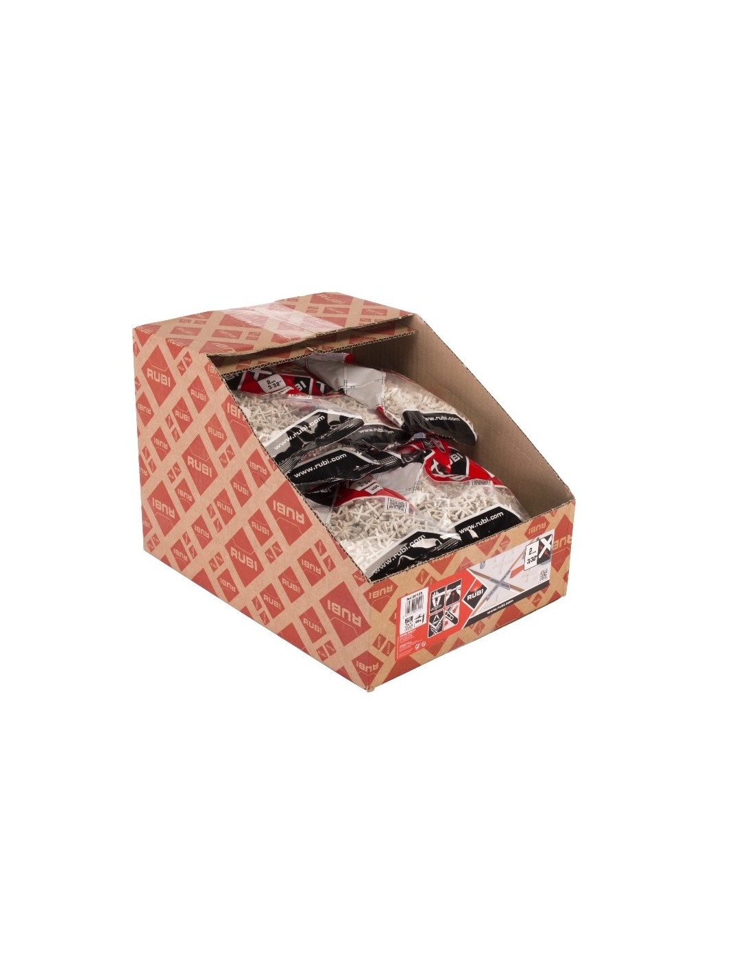 Las crucetas y cuñas RUBI son, sin ninguna duda, una gama realmente indispensable para la obtención de unos acabados perfectos en cualquier trabajo de instalación de baldosa cerámica.Los colocadores profesionales buscan el mejor acabado para todos sus trabajos de instalación de baldosa cerámica, y por eso utilizan las crucetas y cuñas RUBI.Esta confianza de los usuarios de todo el mundo genera una gran demanda de la gama de crucetas y cuñas RUBI, y por eso, ofrecemos a nuestros distribuidores los envases Display Box de crucetas y cuñas.Los Display Box de crucetas y cuñas no son solo un envase de grupaje, son cajas dispensadoras que permiten a nuestros distribuidores disponer de una gran estoc de producto en muy poco espacio. El diseño de los Display Box de crucetas y cuñas RUBI permite, al distribuidor RUBI, colocar hasta 5 referencias de la gama de crucetas y cuñas RUBI en tan sólo 1 metro de sus lineales de venta.Las cajas Display Box de crucetas y cuñas RUBI vienen pretroqueladas para que el distribuidor las pueda habilitar, fácilmente, en cajas auto dispensadoras. Además, hay un segundo nivel de apertura pretroquelada para que el cliente pueda acceder, cómodamente, a las últimas unidades de la caja Display Box.Las cajas Display Box de crucetas y cuñas RUBI son una unidad de venta indivisible. El contenido en bolsas varía dependiendo del modelo de cruceta y cuña.Las crucetas y las cuñas RUBI destacan por la regularidad de sus producciones, la homogeneidad en sus medidas y la ausencia de rebabas y cualquier otro pequeño defecto. Estas particularidades permiten a los profesionales que confían en las crucetas y cuñas RUBI obtener unos acabados excelentes y con una total precisión. La marca RUBI es conocida por la gran durabilidad y por la calidad de sus herramientas. Desde hace ya más de 65 años, RUBI fabrica solamente productos de alta durabilidad y resistencia, para poder dar el mejor rendimiento ante las condiciones de trabajo más duras y adaptándose a las exigencias de cada mercado.