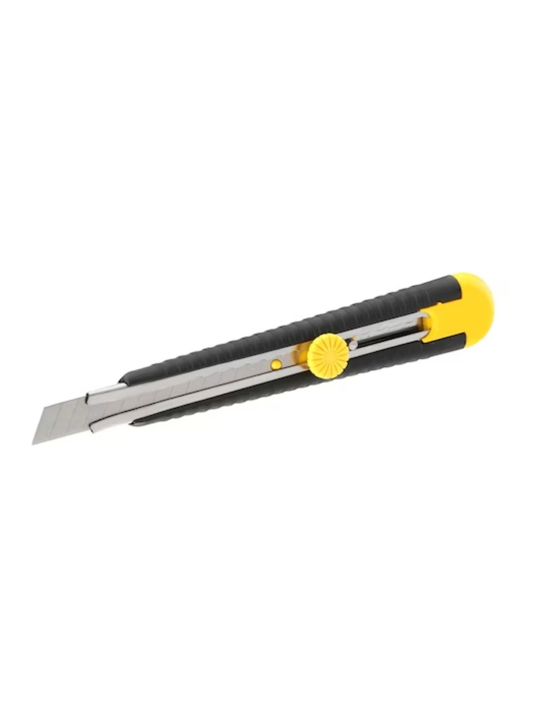 Cuchilla Stanley DynaGrip 9mm desmontable acero inoxidable. Rueda bloqueo seguridad, mango ergonómico polipropileno. Cambio cuchilla sin herramientas.