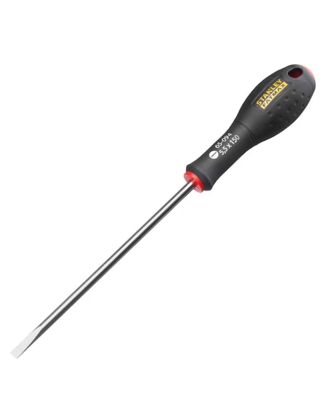 Stanley Fatmax 5.5x150mm, destornillador plano con punta reforzada y acero de alta calidad. Perfecto para tareas exigentes que requieren resistencia y precisión. Mango ergonómico que reduce la fatiga.