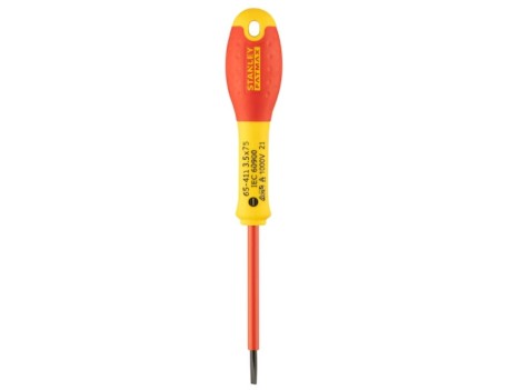 Stanley Fatmax 3.5x75mm, destornillador plano aislado 1000V. Ideal para trabajos eléctricos con seguridad. Mango ergonómico antideslizante y punta reforzada.