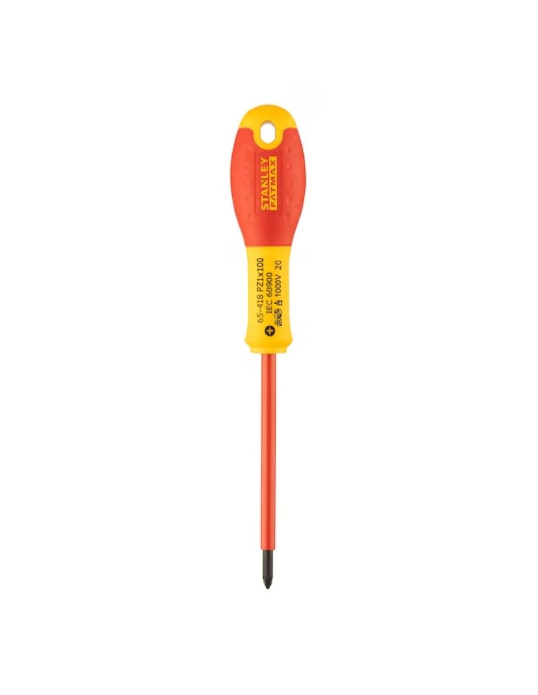 Stanley Fatmax PZ1x100mm, destornillador aislado con punta Pozidriv. Soporta hasta 1000V y ofrece un agarre cómodo y seguro. Ideal para electricistas y técnicos.