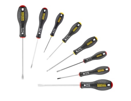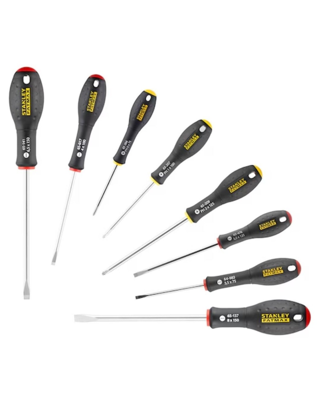 Set Stanley Fatmax con 8 destornilladores planos y Phillips. Incluye diferentes medidas para mayor versatilidad. Fabricados en acero de alta calidad, con mangos ergonómicos antideslizantes. Perfectos para uso profesional y doméstico.