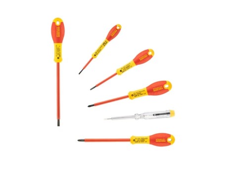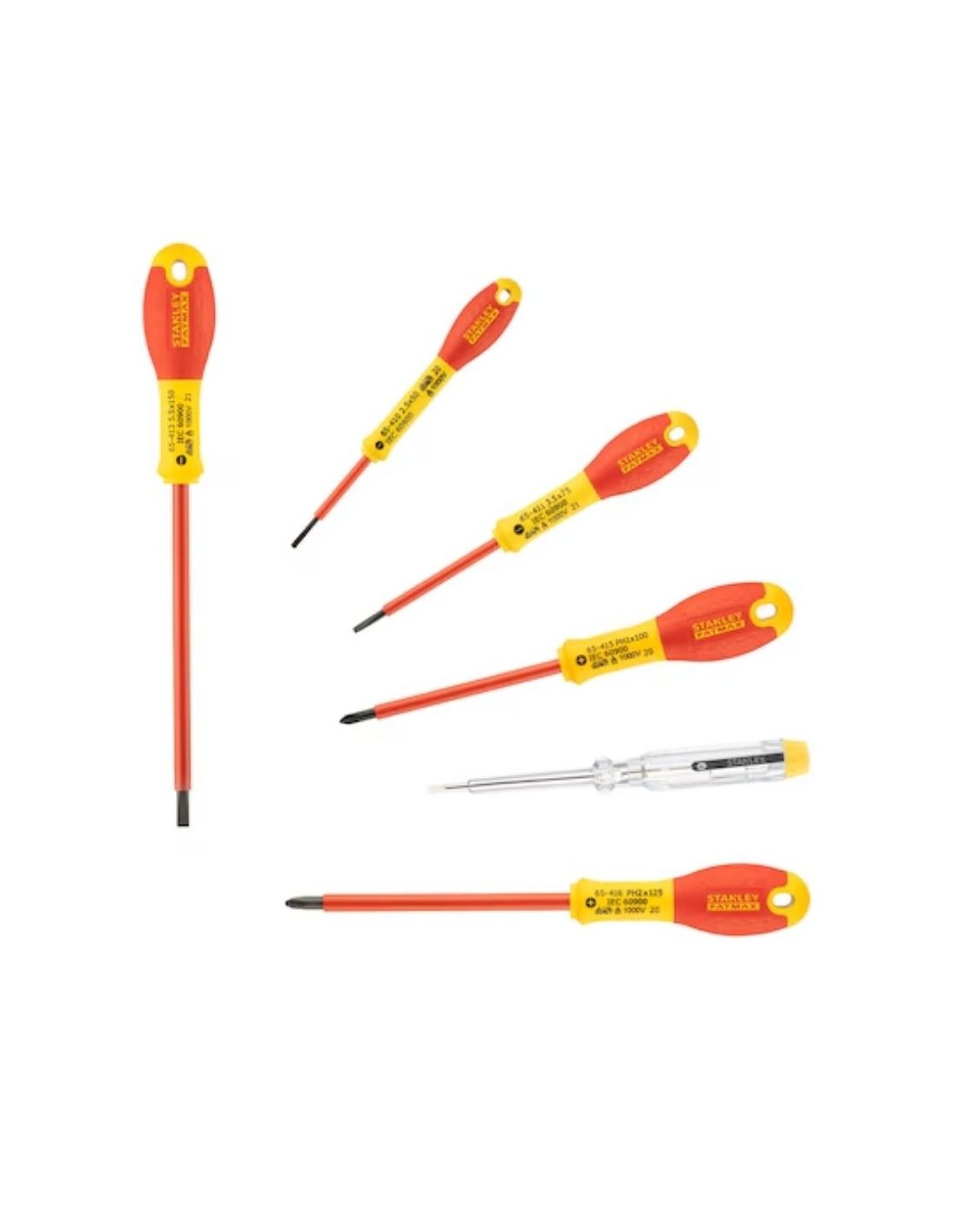 Set Stanley Fatmax de 6 destornilladores planos y Phillips aislados 1000V. Diseñados para trabajos eléctricos con seguridad certificada. Mangos ergonómicos y resistentes para uso intensivo.