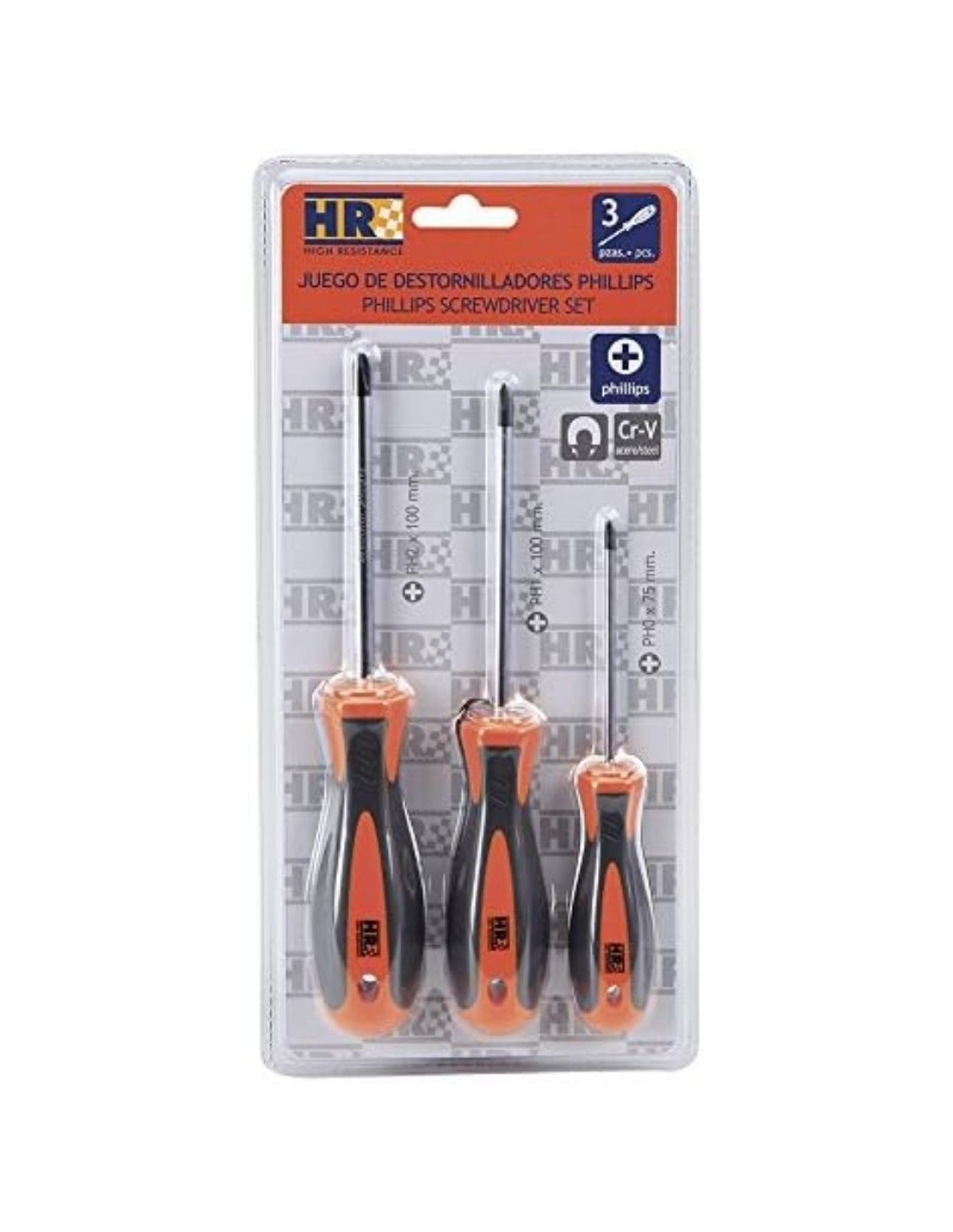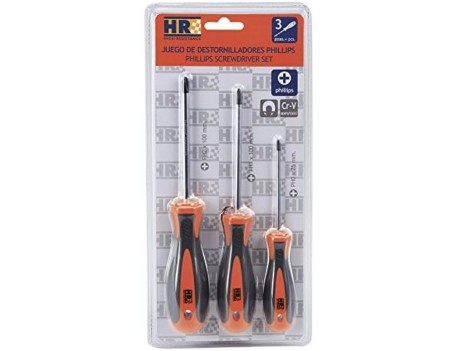 Set HR con 3 destornilladores Phillips de diferentes medidas. Fabricados en acero endurecido con mangos ergonómicos antideslizantes. Perfectos para trabajos de bricolaje y profesionales.
