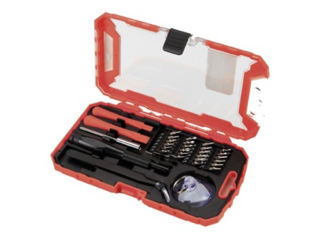 Kit HR de 32 piezas diseñado para reparación de móviles y dispositivos electrónicos. Incluye destornilladores de precisión, puntas variadas y accesorios. Fabricado en acero de alta calidad para durabilidad.