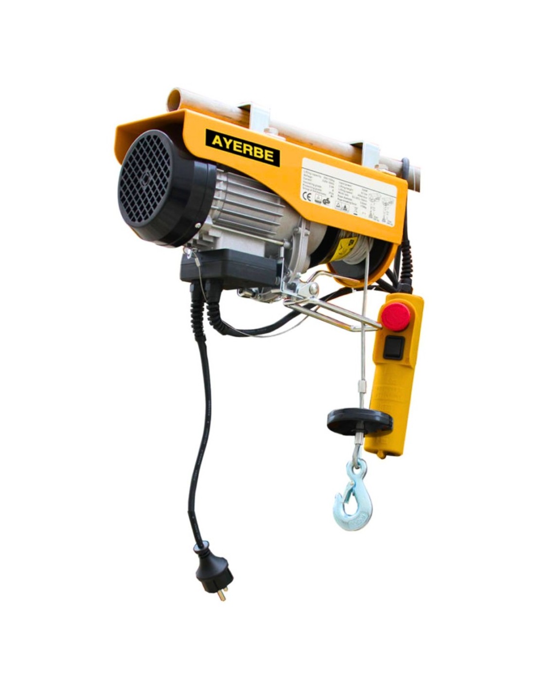 Elevador eléctrico AY 100/200 kg, 550W, cable de 12 m y velocidad 5/10 m/min. Compacto y seguro, ideal para cargas en taller y obra.