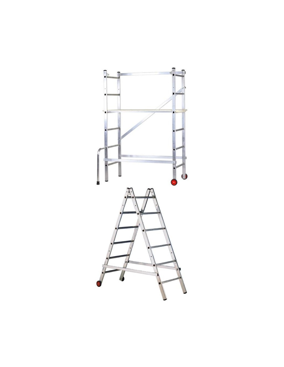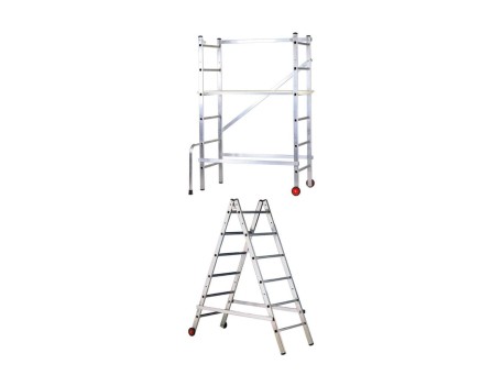 Este andamio de aluminio es un equipo auxiliar ligero y versátil, ideal para trabajos a baja altura, tanto en el hogar como en bricolaje. Se puede transformar en una escalera de mano de dos tramos y ofrece tres posiciones de uso: andamio, escalera de apoyo simple y escalera de tijera doble. Además, cuenta con un peldaño de acceso a la plataforma. Al añadir el tramo de desnivel, la escalera tiene un guardacuerpo y el andamio puede utilizarse en terrenos irregulares.