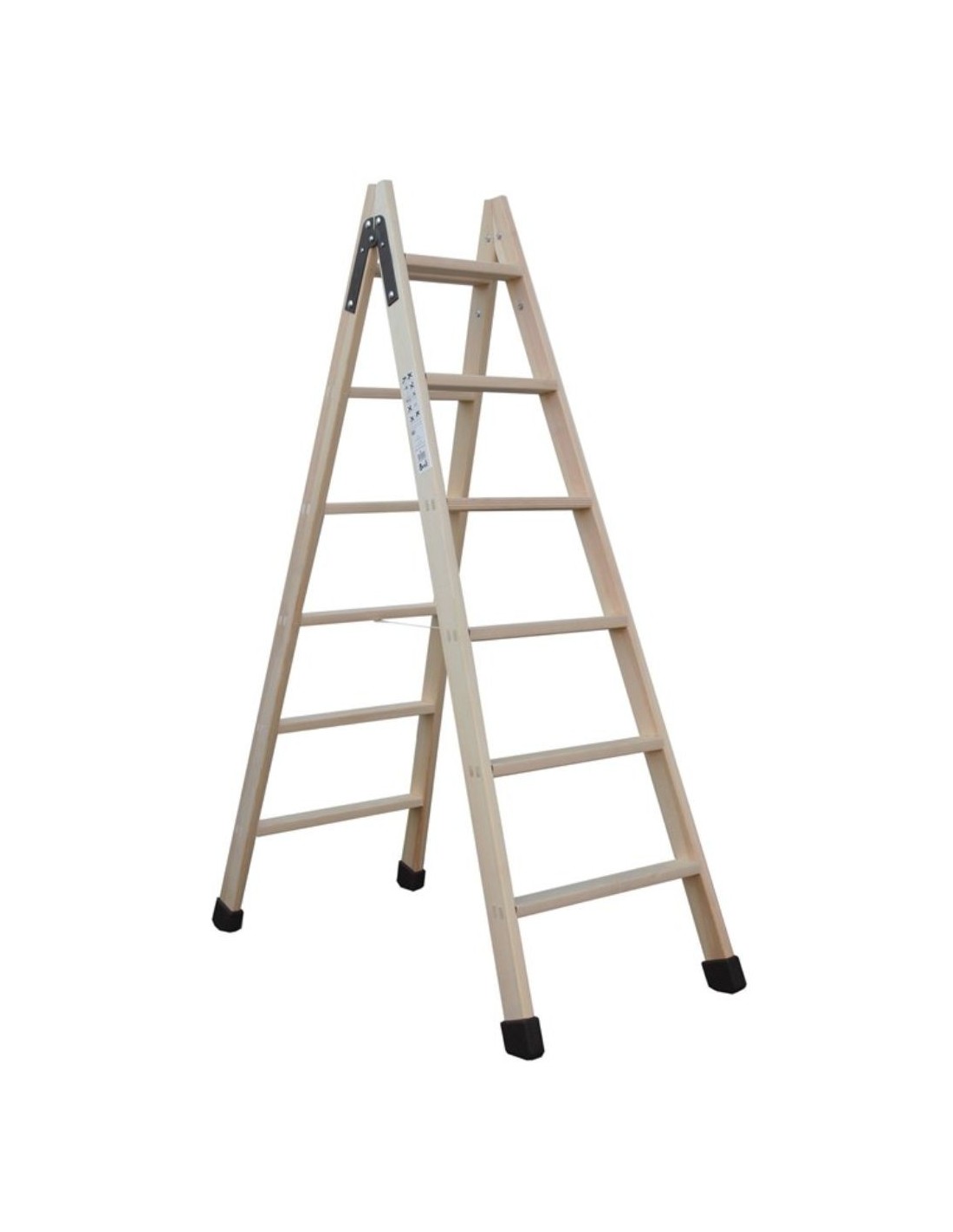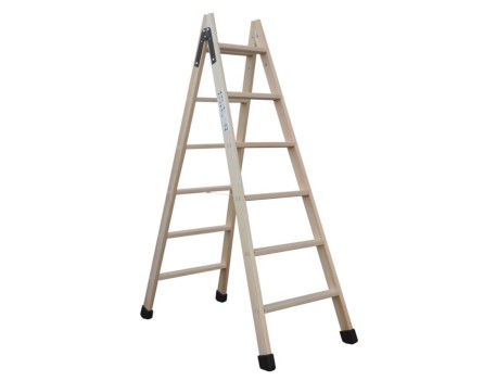 Escalera de tijera de madera de doble subida, fabricada en madera con bisagra de acero reforzado lacado en negro y zapatas de goma antideslizante.