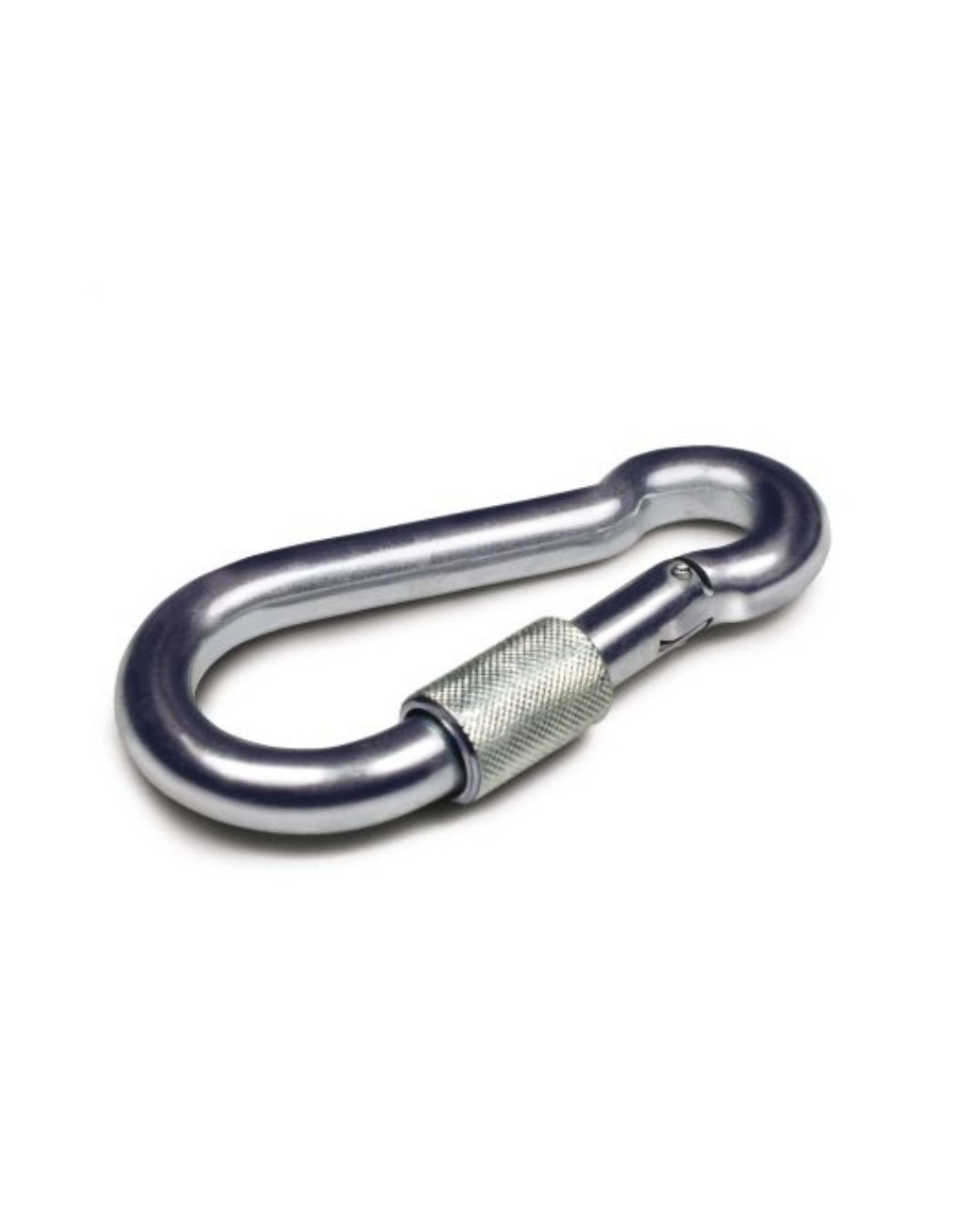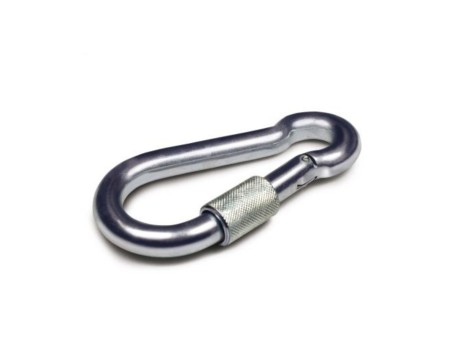 Mosquetón DIN 5299 con seguro D108 8x80mm acero cincado. Carga trabajo 230kg. Rosca interior y estriado exterior. Uso industrial cable y cadena NO EPI.