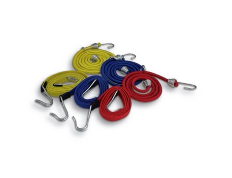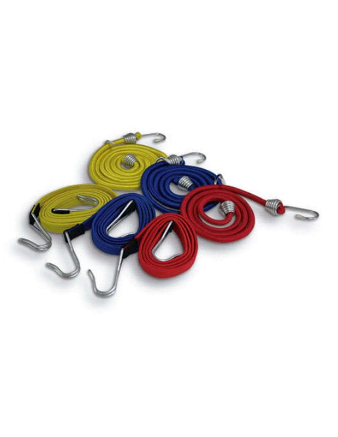 Tensor elástico de goma GAYNER modelo TSR-100 en color rojo, referencia 71-010. Set de 2 unidades. Medidas 8mm ancho x 1000mm largo. Capacidad de carga 25kg. Fabricado con multifilamentos de polipropileno trenzados resistentes al agua y rayos UV. Provistos de dos ganchos de acero que permiten unir distintas correas para obtener cintas más largas. El nudo de la cuerda elástica se esconde dentro del gancho modelo redondo para facilitar uso y garantizar buen agarre. Ideal para sujeción de objetos en motocicletas, coches, bicicletas, camiones, embarcaciones. Máxima elasticidad y durabilidad profesional.