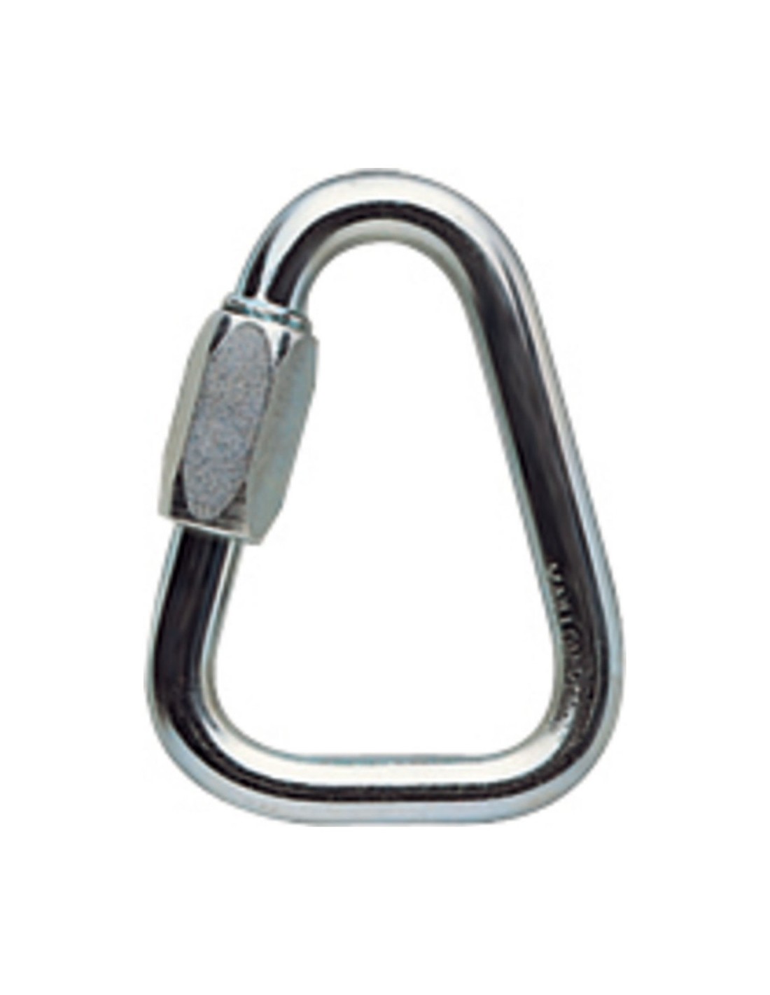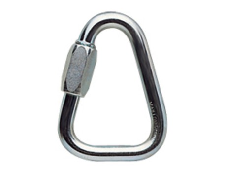Maillón de acero Delta Petzl P11 forma triangular, diámetro 10mm. Resistencia eje mayor 45kN, eje menor 10kN. Abertura 12mm. Certificado CE EN 362 tipo O, EN 12275.