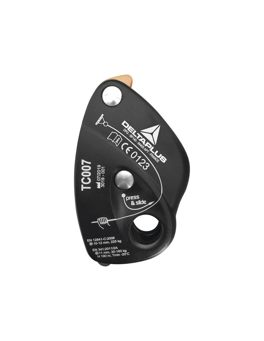 Descensor multiusos aluminio, modo bloqueo o descenso, compatible cuerda 9-13mm, indicador uso correcto, para técnicos acceso cuerda, especializado rescate, CE EN12841, compacto y ligero.
