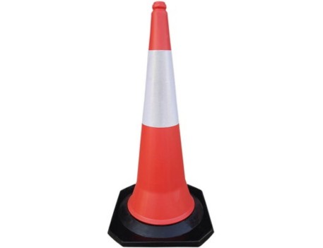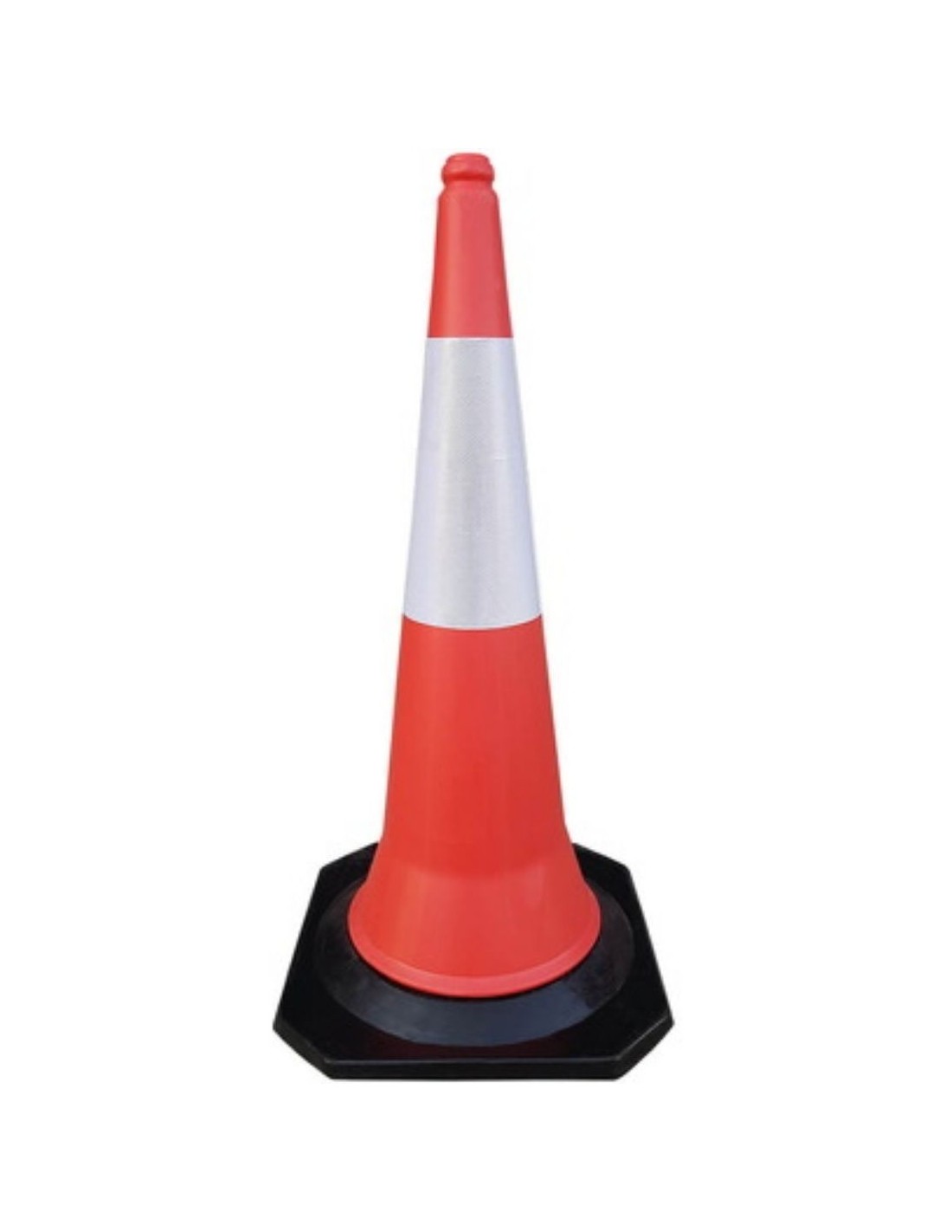 El cono está fabricado en polietileno (PE) con base de caucho, se compone de dos piezas, tiene una altura de 100 cm, un peso de 5 kg, una base de caucho de 48x48 cm y una banda reflectante de 30 cm.