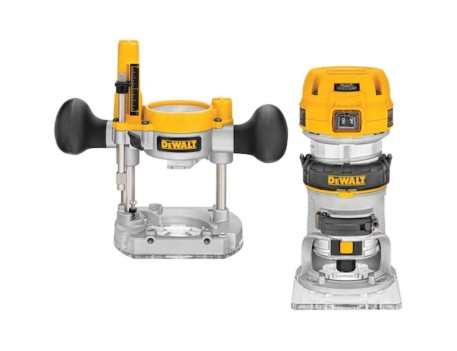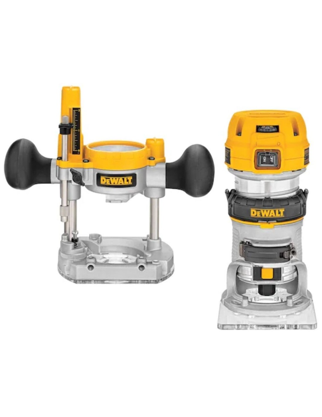 Fresadora combo DEWALT 900W electrónica 6-8mm. Velocidad variable 16000-27000 rpm, base fija intercambiable, LED integrado. Control precisión.