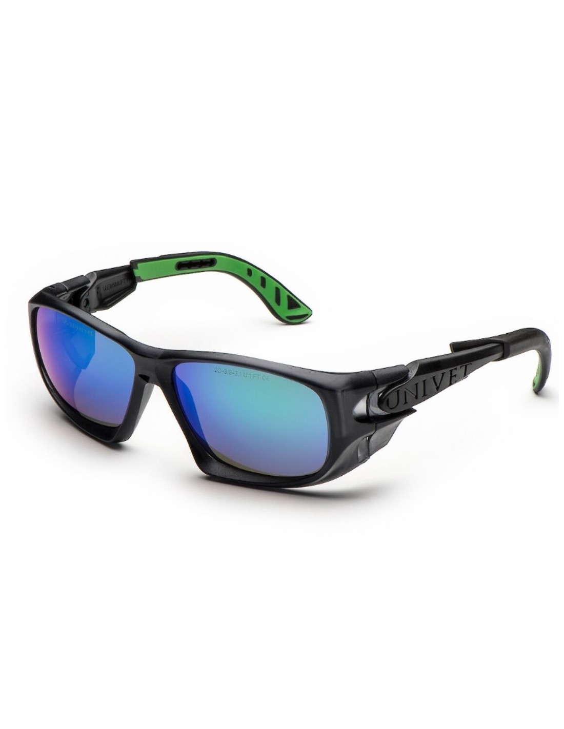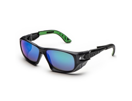 Gafas protección deportiva 5X9 SPORT Solar Mirror Univet Safety que revolucionan seguridad industrial combinando máxima protección impactos con comodidad y ligereza gafas deportivas. Lentes espejo verde/azul policarbonato filtran alta luminosidad con tecnología antiarañazos UV380.