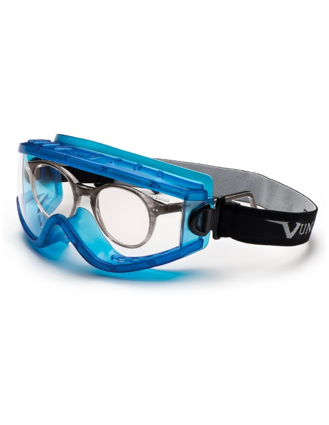 Lente policarbonato incolora con tecnología antiarañazos, antiempañante y UV380. Resistencia impacto media energía tipo B. Amplia banda elástica completamente regulable garantiza ajuste perfecto. Ventilación indirecta evita empañamiento. Montura azul distintiva clase óptica 1.