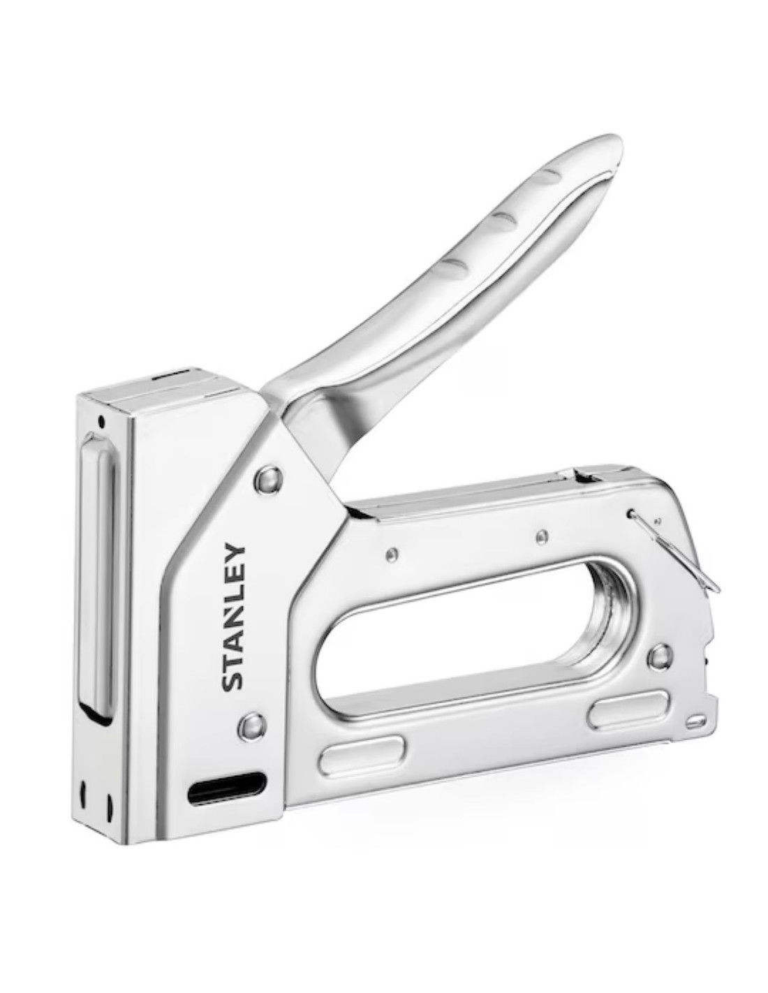 Grapadora Stanley TR110 tipo G servicio pesado acero. Indicador recarga sujetador, carga inferior, grapas 6-8-10-12-14mm, peso 0.76kg, dimensiones 190x160x30mm.