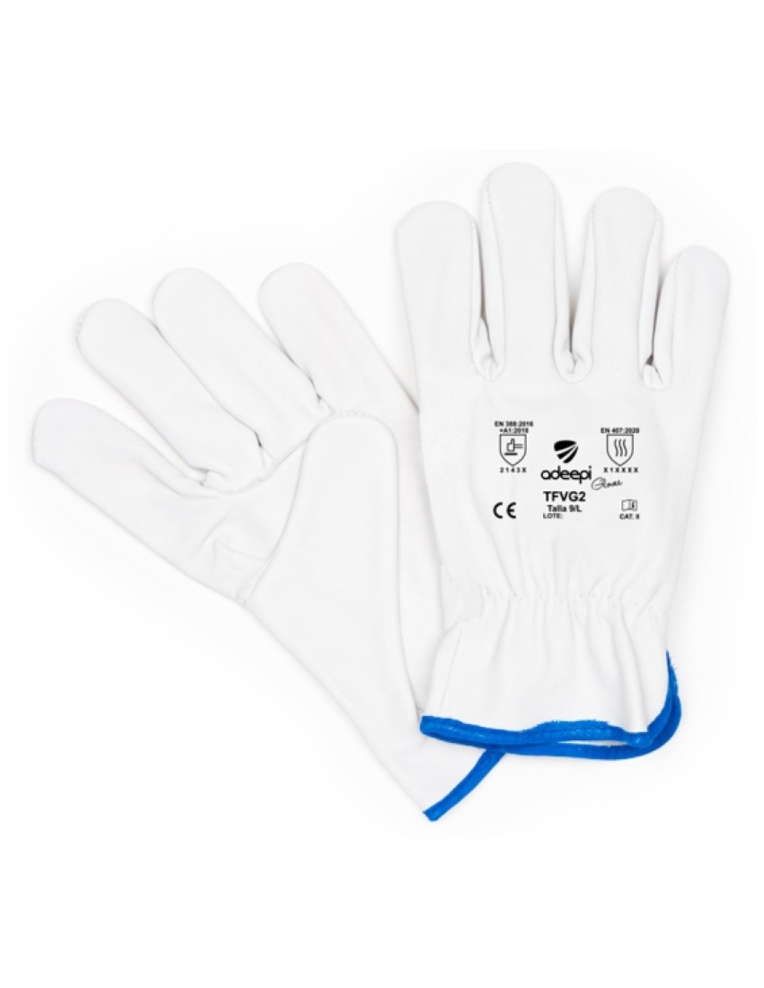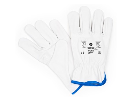Guante profesional cinco dedos con palma fabricado totalmente en piel flor vacuno blanca. Incorpora goma elástica interior en dorso para mejor ajuste y ribeteado en muñeca. Certificado EPI Categoría II según normas EN ISO 21420:2020, EN 388:2016+A1:2018 y EN 407:2020.